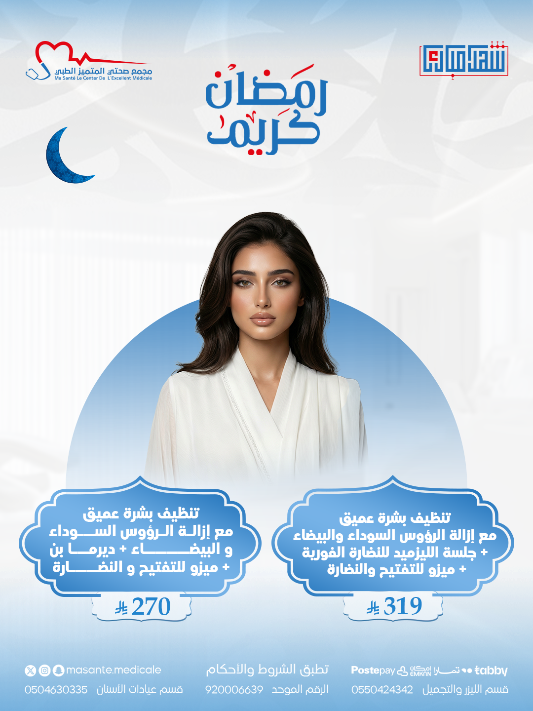 | العروض | تنظيف بشرة عميق مع ازاله الرؤوس البيضا والسوادء+جلسة اليزميد لنضارة الفورية +ميزو للتفتيح النضارة, تنظيف بشرة عميق مع ازاله الرؤوس البيضا والسوادء +ديرما بن +ميزو للتفتيح النضارة |