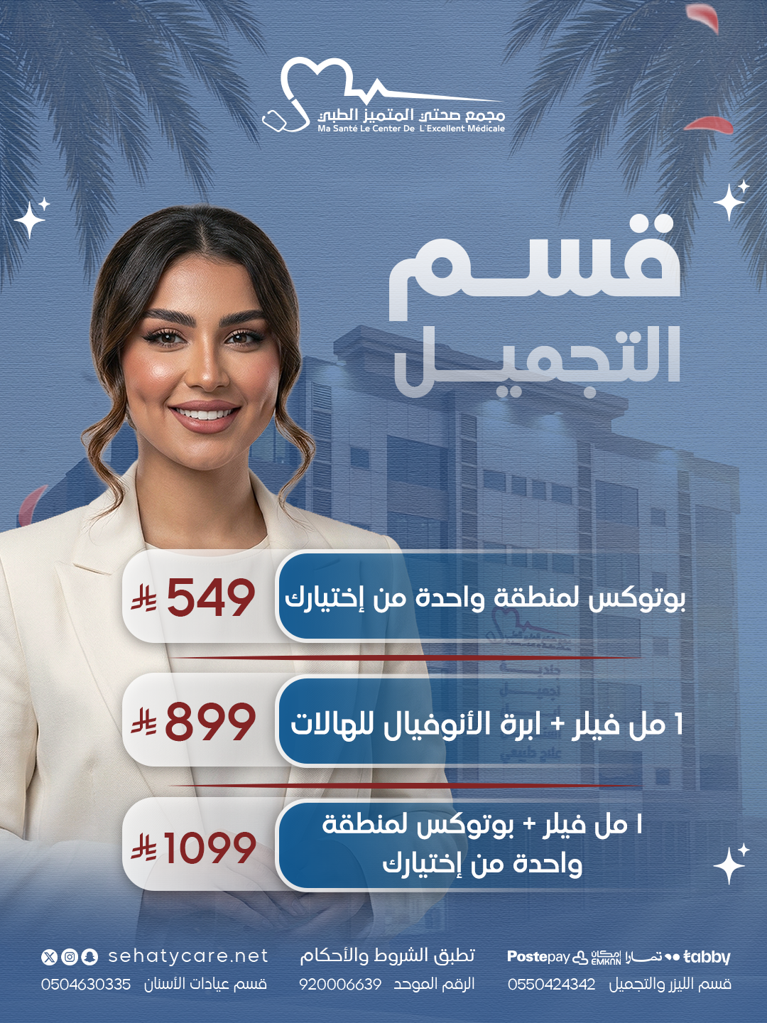 | عروض التجميل | بوتوكس لمنطقة واحدة من اختيارك, 1مل فيلر +ابرة الانوفيال للهالات, 1مل فيلر + بوتوكس لمنطقة واحدة من اختيارك |