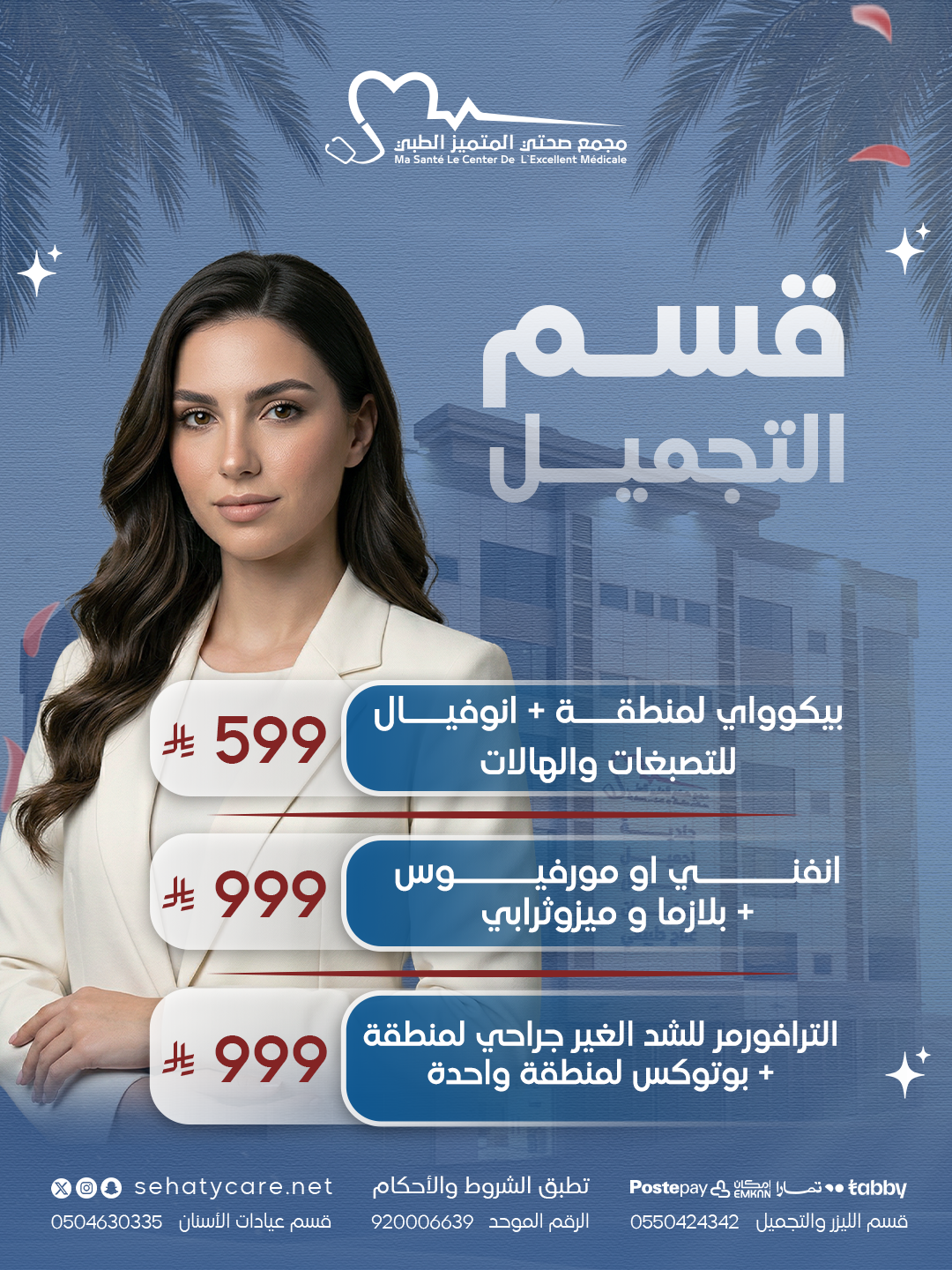| عروض التجميل | بيكوواي لمنطقة + انوفيال التصبغات والهالات, انفني او مورفيس + بلازما و ميزوثرابي, الترافورمر للشد الغير جراحي لمنطقة + بوتوكس لمنطقة واحدة |